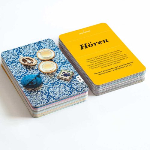 Aus der Stressforschung ist bekannt, dass es äußerst effektiv ist, täglich ein paar Minuten von der Hektik loszulassen. So entstand die Idee, ein inspirierendes Kartenset mit simplen und praktikablen Anleitungen zu entwickeln. Es besteht aus 108 kurzen, stressreduzierenden Achtsamkeits Übungen, die sich leicht in den Alltag integrieren lassen. Ein Bild nimmt Bezug auf das Thema und kann leicht als visuelle Erinnerung in den Alltag integriert werden.
